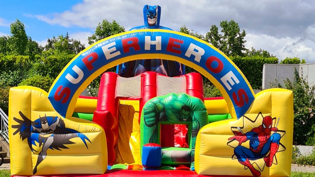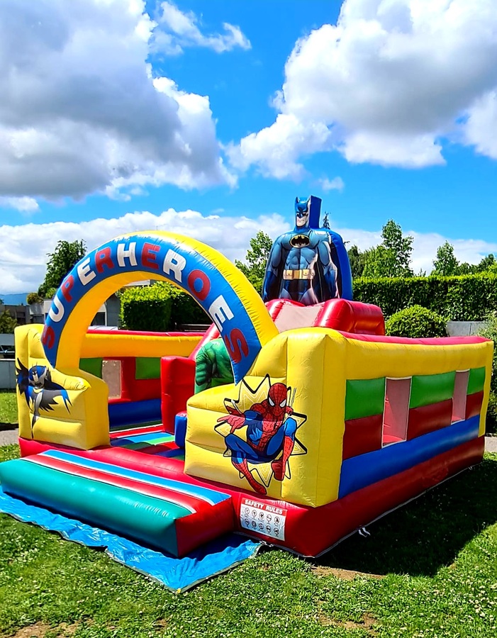 Château Super Heroes - deux toboggans à l'intérieur, parcours et terrain de saut.